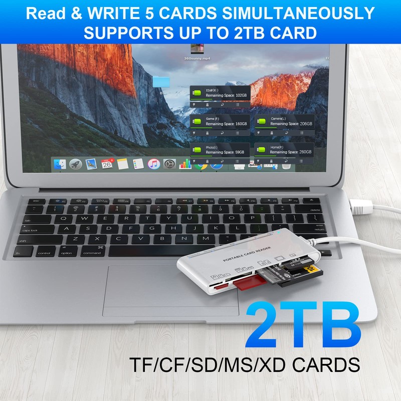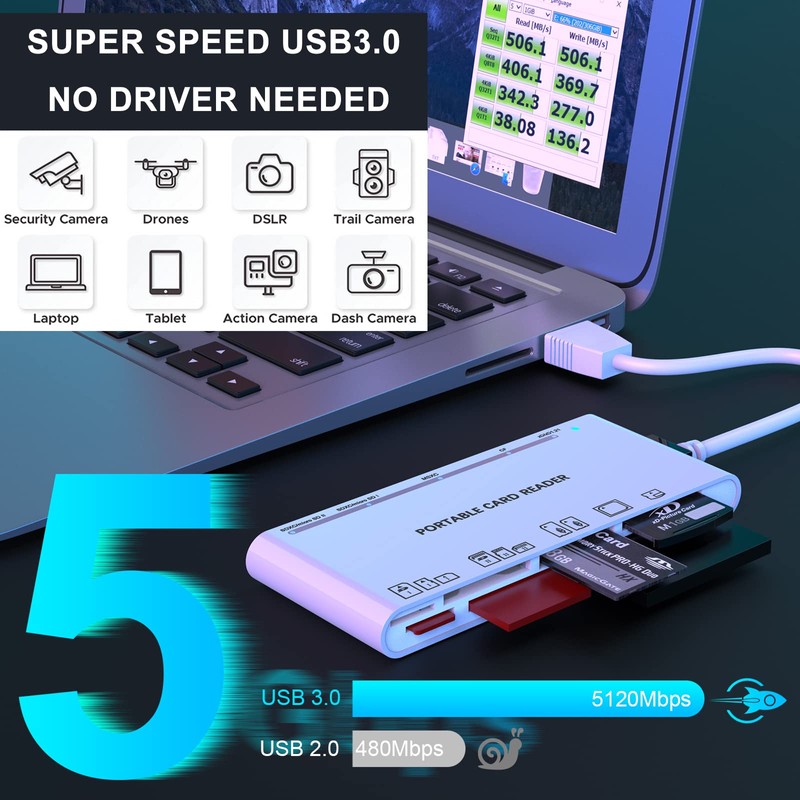 - 🌈【SD Card Reader USB 3.0 Super Speed Transfer】Card reader USB 3.0 for computer with 5Gbps data transfer speed, backward compatible with USB 2.0/1.1. Super Speed (5gpbs), High Speed (480mbps), Full Speed (12mbps), quickly transfer your pictures and videos from memory card to computer. It is 10 times faster than USB 2.0 (480 Mbps). USB Card Reader can support up to 2TB memory card.