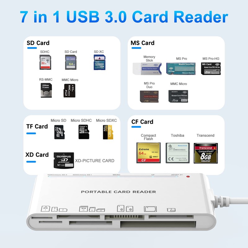 USB3.0 Multi Card Reader, High Speed SD/TF/CF/Micro SD/XD/MS 7-in-1 Memory Card Reader/Adapter/Hub for SD, CF, Micro SD, SDXC, Micro SDHC, Micro SDXC, MS Card, Windows/Mac OS/Android/Linux