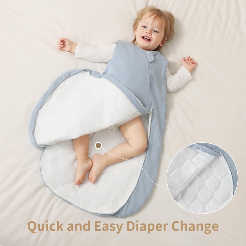 - Smooth 2-Way Zipper: Unzips from the top, which makes it easy to place baby in sack. Unzips from the bottom, which makes it convenient for diaper changing. Our toddler sleeping sacks are designed to provide optimal comfort for babies and convinience for parents