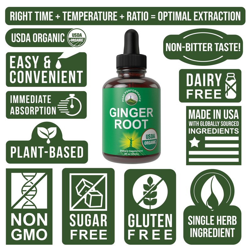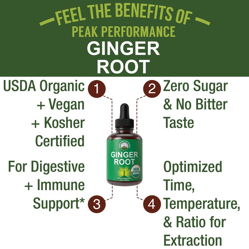 - Not All Ginger Root Extract Liquids Are The Same - many ginger supplements on the market are untested and unreliable. With Peak Performance USDA Organic Ginger Root Liquid Drops Supplement, you get the highest quality ingredients we could find. We created a balanced, absorbable formula with optimized time, temperature, and ratio for extraction.