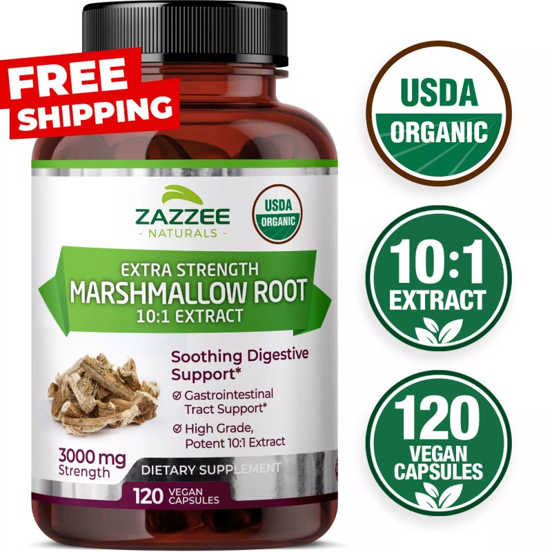 Zazzee Naturals Certified Organic Marshmallow Root Extract provides 3000 mg strength per capsule and contains 120 capsules per bottle -- the best value available!