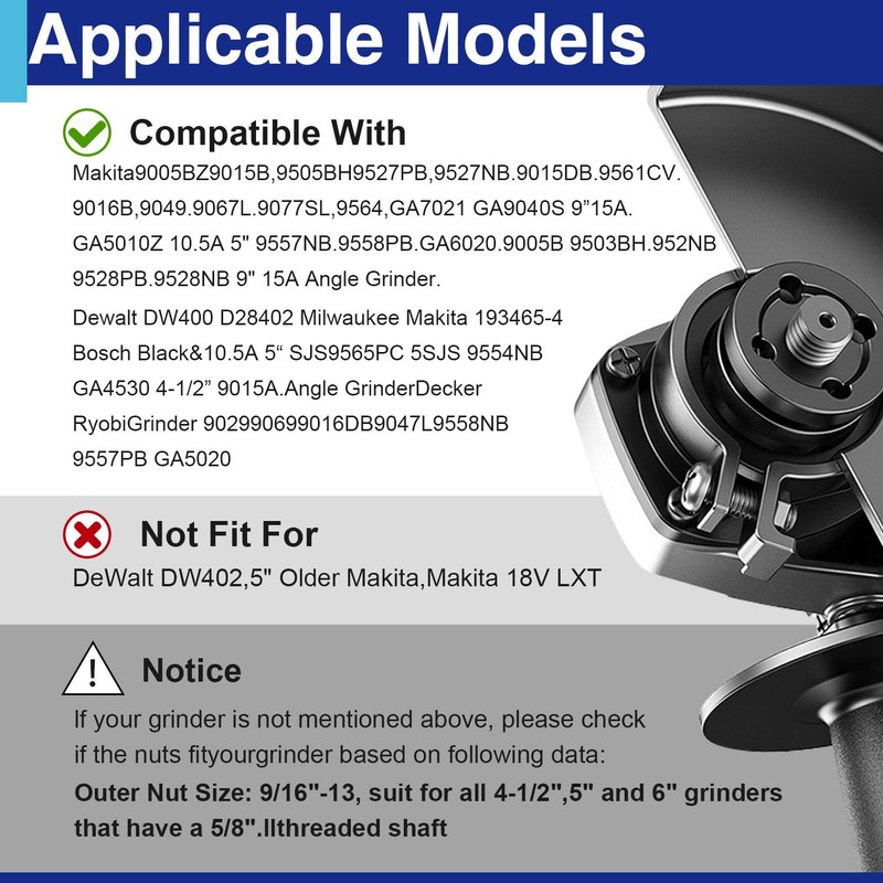 Noteworthy compatible models encompass 9016DB, 9047L, 9558NB, 193465-4, 9554NB, 9015A, 9069, Ryobi 9029, 9557PB, GA5020, 10.5A 5" SJS, 9565PC 5" SJS, 9005BZ 9015B 9505BH 9527PB 9527NB 9015DB 9561CV 9016B 9049 9067L 9077SL 9564,GA7021, GA9040S 9" 15A, GA5010Z 10.5A 5", 9557NB, 9558PB, GA6020, 9005B, 9503BH, 9524NB, 9528PB, 9528NB 9" 15A Angle Grinder, etc and more.