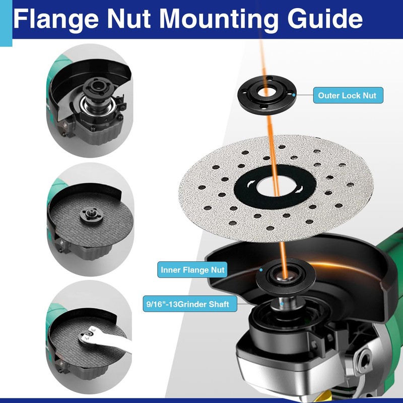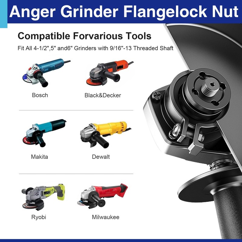 - Versatile Compatibility: These angle grinder flange nuts are designed to work seamlessly with angle grinders equipped with a 9/16"-13 threaded shaft. Compatible with tools commonly associated with leading brands such as Makita, Milwaukee, Bosch, Black & Decker, Ryobi, and Dewalt, they offer a reliable solution for a wide range of grinding applications.