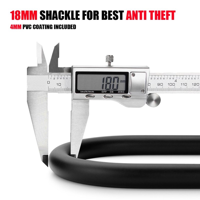 - STRONG SHACKLE: The 14 mm hardened zinc alloy shackle resists both cutters and leverage attacks. 4mm PVC coating protects the lock from any scratching.