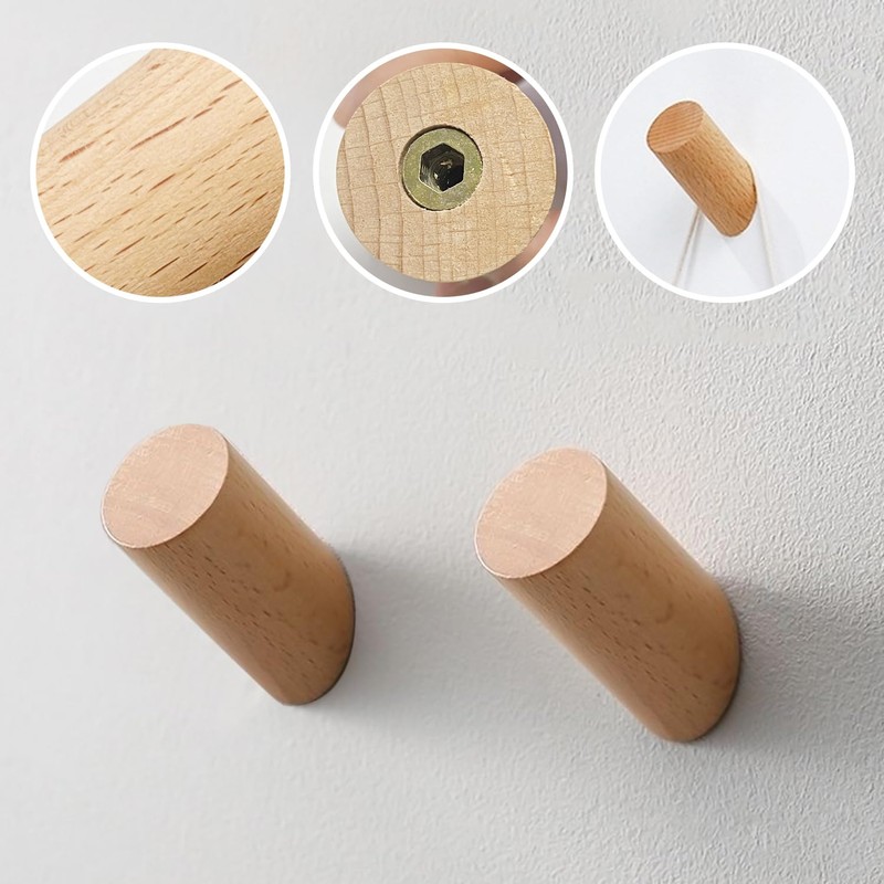USHXVG Pack of 4 Beveled Wooden Hooks, Door Hooks, Wall Coat Racks, Wall Decor Hooks, Cylindrical Single Hooks, Suitable for Kitchens and Bathrooms