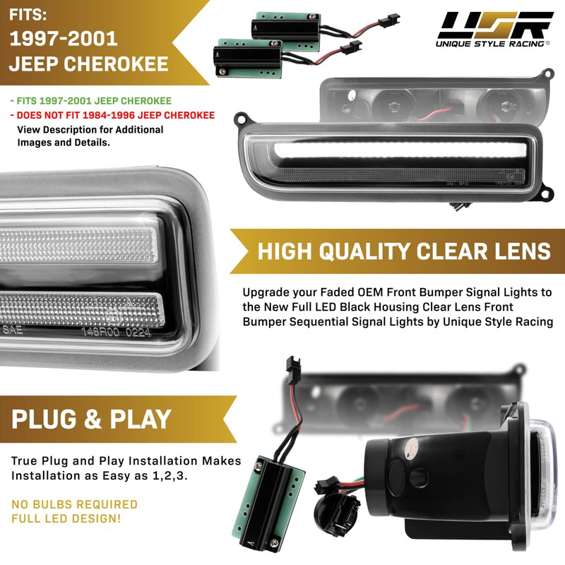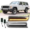 - ✔️ 《 BLACK HOUSING FRONT LED SEQUENTIAL / SWITCHBACK TURN SIGNAL LAMPS 》 Time to update your old, faded or even damaged stock Lights with These Black Housing Front LED Amber Sequential Turn Signal and White DRL/Parking Switchback Front Lamps Set of 2 Pieces. Perfect 97-01 Cherokee XJ Sport Utility Vehicle Accessories to Upgrade and a great gift Idea or Replacement Part. Compatible with 1997-2001 Jeep Cherokee SUV XJ All Models Such as Classic, Country, SE, Sport, Limited.
