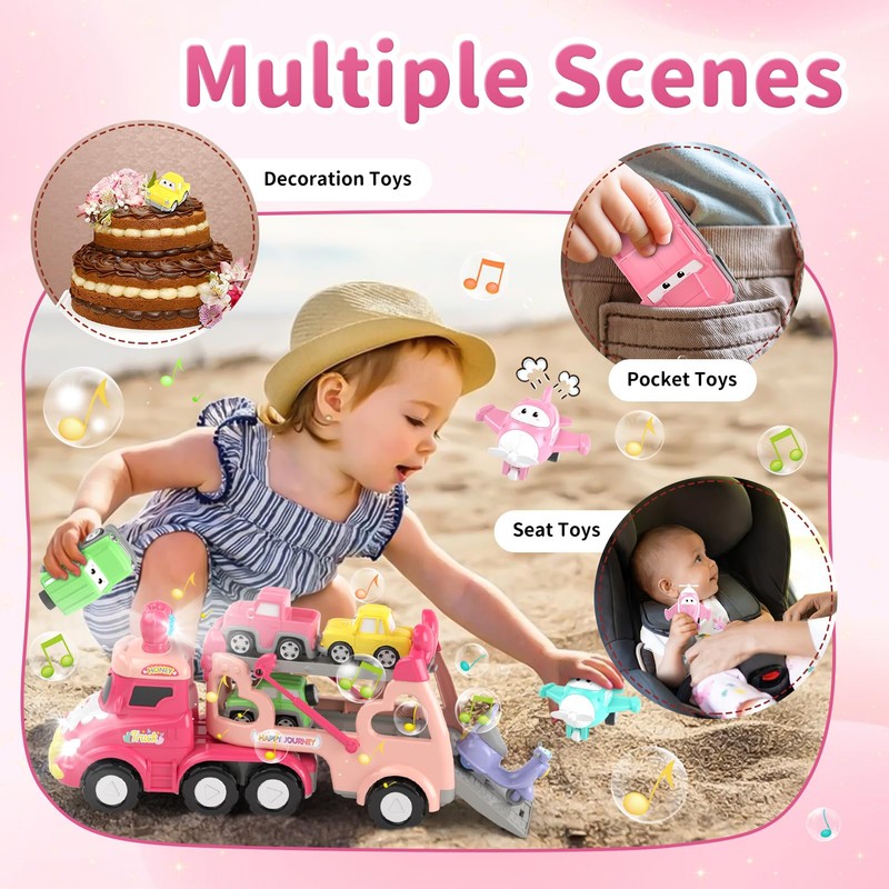- [Toddler Girl Truck Toy Set] Usrela 7 in 1 Pink double-decker truck car set, including a large crown truck and 5 different shapes of cars and 1 plane and 1 motorcycle, girls car set can not only help girl identify different vehicles, but also the unique pink and diverse cars will bring more fun to girls and win girls' love. It is the best 1 2 3 year old girl birthday, Easter, Christmas gift.