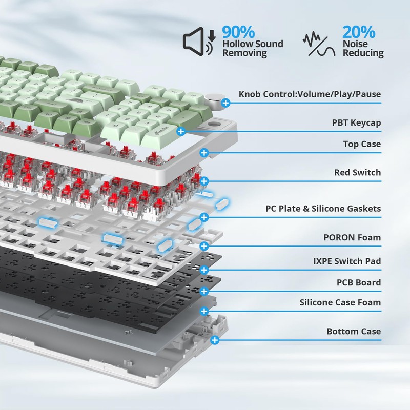 • 【Gasket Keyboard with Three-Layer Padding】The gasket design provides a unique cushioning effect, resulting in a softer and more flexible keystroke. This reduces finger fatigue during long typing sessions and creates a more comfortable typing experience. Coupled with three layers of sound-absorbing padding, this structure significantly dampens keystroke noise.