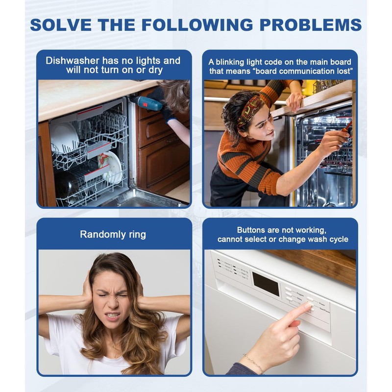 - Solving problems: 1.Randomly ring. 2.The motherboard displays "board communication lost". 3.Buttons are not working, cannot select or change wash cycle. 4.Dishwasher has no lights and will not turn on or dry