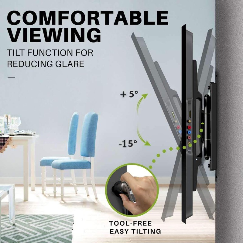 - Full Motion Adjustable: The swivel tv wall mount can be tilted +5°/-15°and swivesled +/-45°for more comfortable viewing experience. You can pull out the tv mount bracket to 19.0" and retract back to 3.35", which save some valuable space for you.