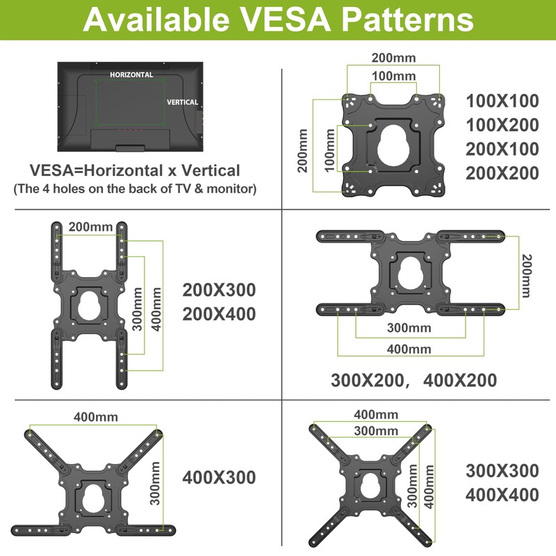 Must match--100x100(4”x4”), 200x100(7.87”x4”), 200x200(7.87”x7.87”), 300x300(11.8”x11.8”), 400x200(15.7”x7.87”), 400x300(15.7”x11.8”), 400x400(15.7”x15.7”), the max weight up to 88lbs.