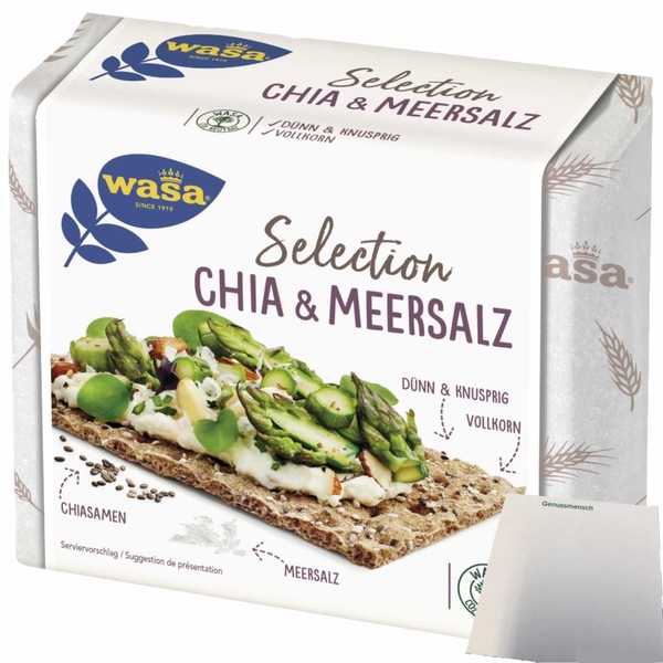 usy Bundle: Wasa Selection Chia & Sea Salt (245 g pack) + usy block compatible with: Wasa Selection Chia & Sea Salt (245 g pack) + usy Block Ingredients: rye whole grain flour (101 g*), chia seeds (Salvia hispanica) (8.6 g*), yeast, sea salt (0, 5g*), SalSalSale.g. *in g per 100g product. May contain traces of milk and sesame seeds. Nutritional values: nutritional values per 100 g in g: 1461KJ/348 Kcal/fat: 3.6 > of which saturated fatty acids: 0.5 > of which unsaturated fatty acids: 0, carbohydrates: 58 - of which sugar: 1/protein: 10/salt: 1.2. Allergen: GlSeed containing cereals and products derived from it. Possible allergens included: sesame seeds and products derived from them. Manufacturer of individual products: usy Product: Brabanat EURL, 40rue d Dt.M.Deutsch, F-67250 Soultz-Sous-Forets other products in the bundle: Barilla Deutschland GmbH, Gustav-Heinemannen. 72-72-sho, 50968 Cologne, Germany. Notes: Storage note: store in a cool and dry place. Warning: Danger: