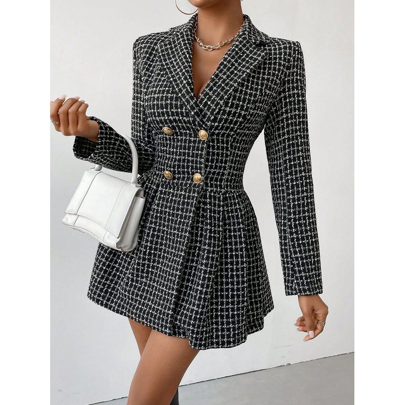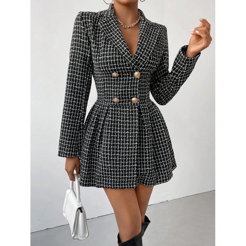 utcoco Women's 2025 Fall Plaid Tweed Dress Notched Lapel Double Breasted Eleg...