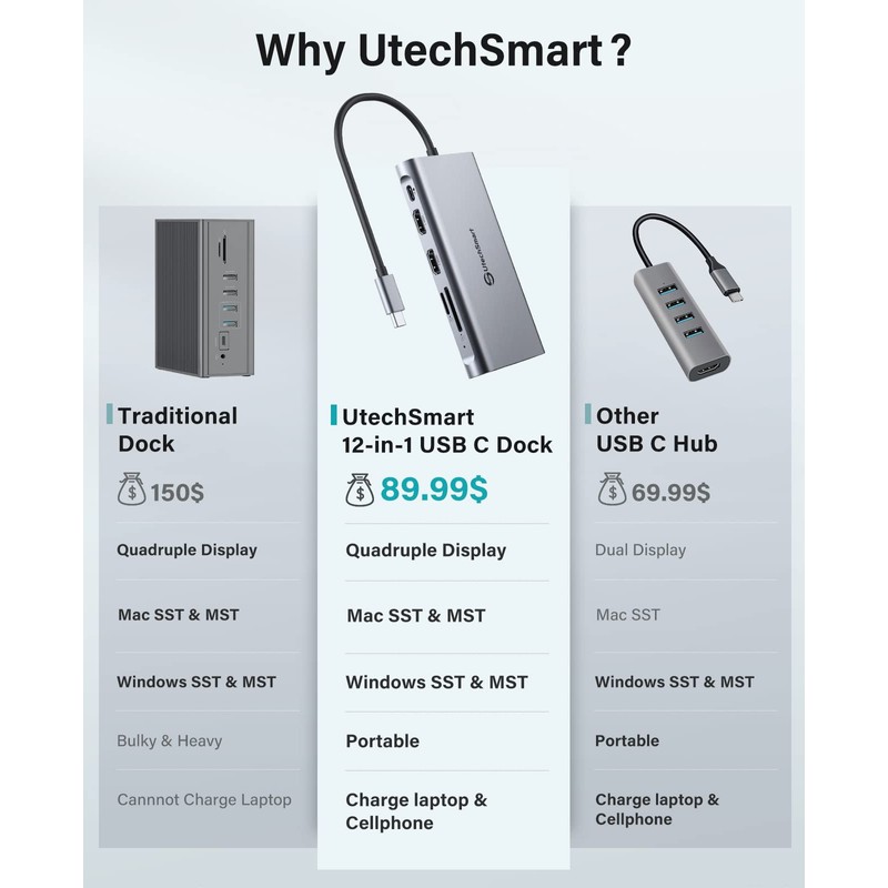 - New Reforms For Dock: Through the upgrade and improvement of the chip by UtechSmart’s R&D team, the 12-in-1 USB C docking station provides stable performance, solid connection, ultra-low latency and heat dissipation. It solves the common macOS single-stream display and black screen issue when using MST display support for Windows. A powerful workstation in a compact size.