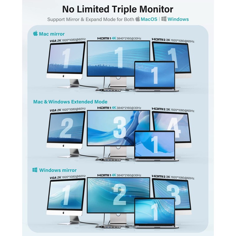 - Extreme Expansion: The ultra-lightweight and compact USB C docking station combines 12 ports with multi-functions, to provide you a more convenient home, office and business travel experience. Contains 1x 4K HDMI 1, 1x HDMI 2, 1x VGA, 2x USB 3.0, 2x USB 2.0, 1x Gigabit Ethernet(10/100/1000), 1x USB-C Power Delivery, 1x USB-C Data Transfer, 1x SD/TF (can read simultaneously).