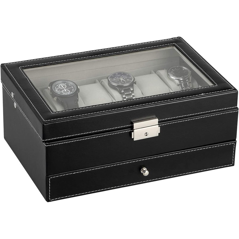 - Watch Box Storage: This 12 slots double-layer display box is a wonderful item allowing a gentleman or lady to display his or her entire collection of chronometers, tastefully protects, stores, organizes 12 watches in the first layer.