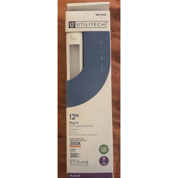 Illuminate your kitchen or workspace with the Utilitech 0877634 12 Inch Long LED Plug In Undercabinet Light. This under cabinet lighting fixture is designed to provide a bright and warm ambiance with a color temperature of 2500 - 3000 K. The light direction is downwards, and it has a luminescent output of 300 lumens.
