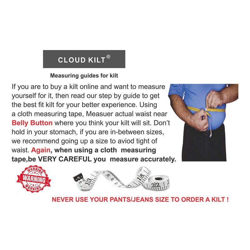 - Size Instruction: Don’t select regular pants/jeans sizes. Using a cloth measuring tape, Measure the actual waist at the BELLY BUTTON where you think your kilt will sit. Order the size you measure.