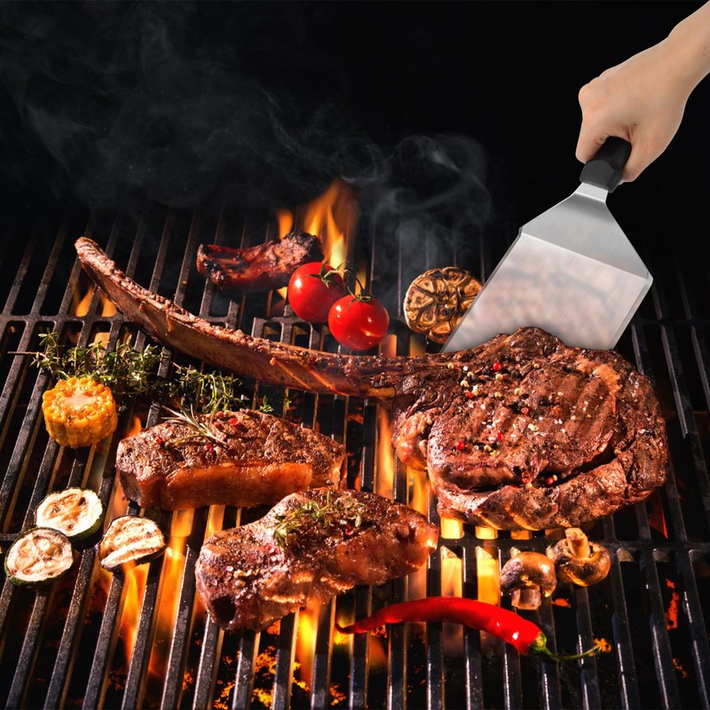 - MULTIPURPOSE The barbecue spatula set is suitable for kitchen, camping and other occasions, ideal for flipping steaks, burgers, pancakes and fish, cutting sausages, pizza, lasagna, also can be used as a cleaning tool to clean the grill, it is an indispensable spatula set for any kitchen.
