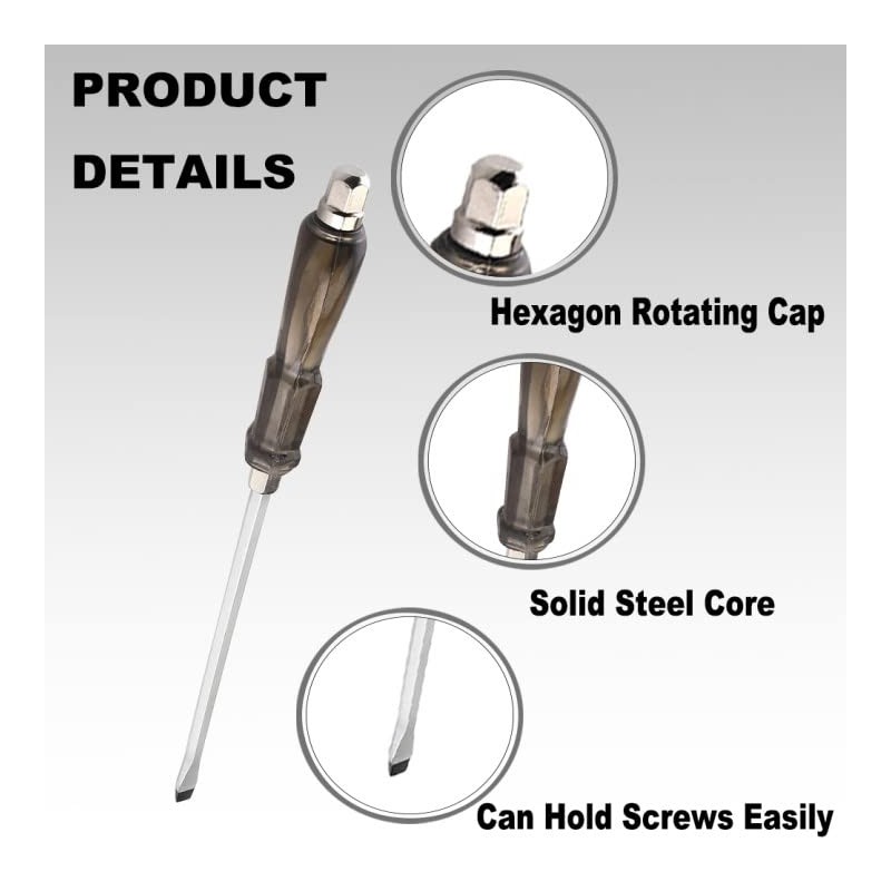 - 【Magnetic tip to hold screws】-Slotted screwdriver set with magnetic tip makes it perfect for work. It can hold screws easily on the magnetic tip.Make it easy to simply lift the screw after it is finished unraveling.