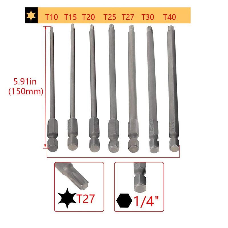 - [1]: ) FEATURES: Type of shank: 1/4 inch hex shank ; Size: Torx (T10 T15 T20 T25 T27 T30 T40); Overall length:150 mm/ 6-inch ; Material: S2 Alloy Steel.