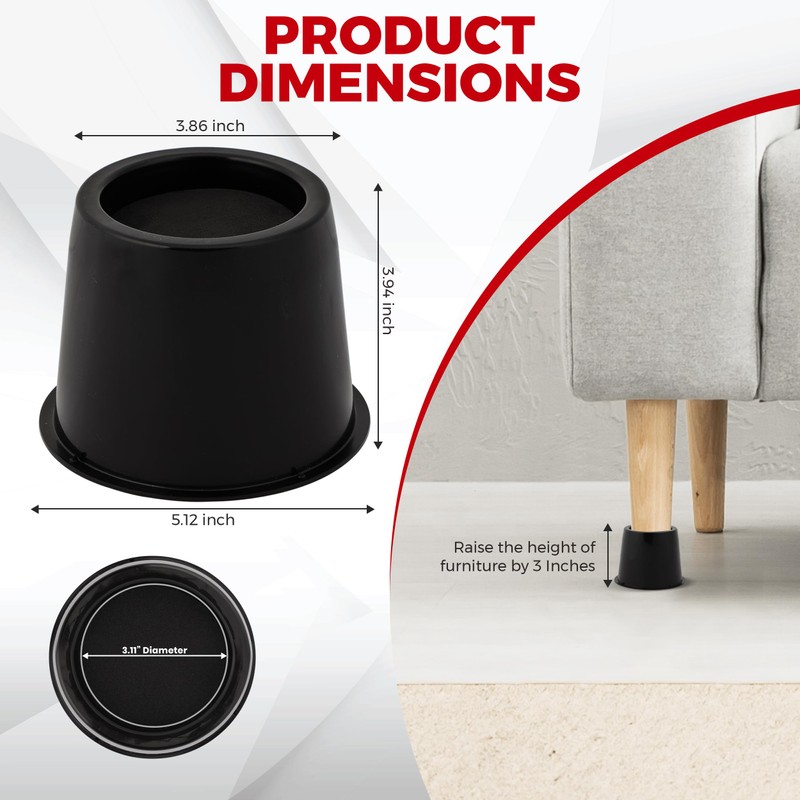 - PACK OF ROUND RISERS – Add more space under your bed or lift up your furniture for better access with these round furniture risers 3 Inch. The set raises your beds, couches, tables, desks, dressers, sofas, etc., by 3 Inches.