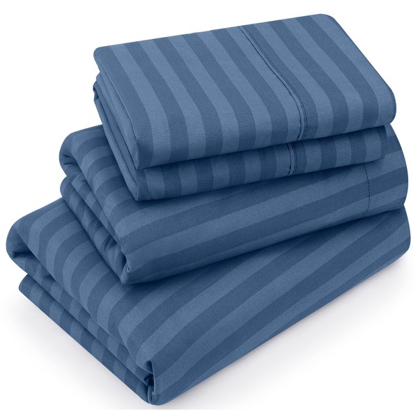 Utopia Bedding Queen Sheet Set, Soft Microfiber 4 Piece Bed Sheets with 15" Deep Pocket - Easy Care Brushed Microfiber (Stripe - Navy)