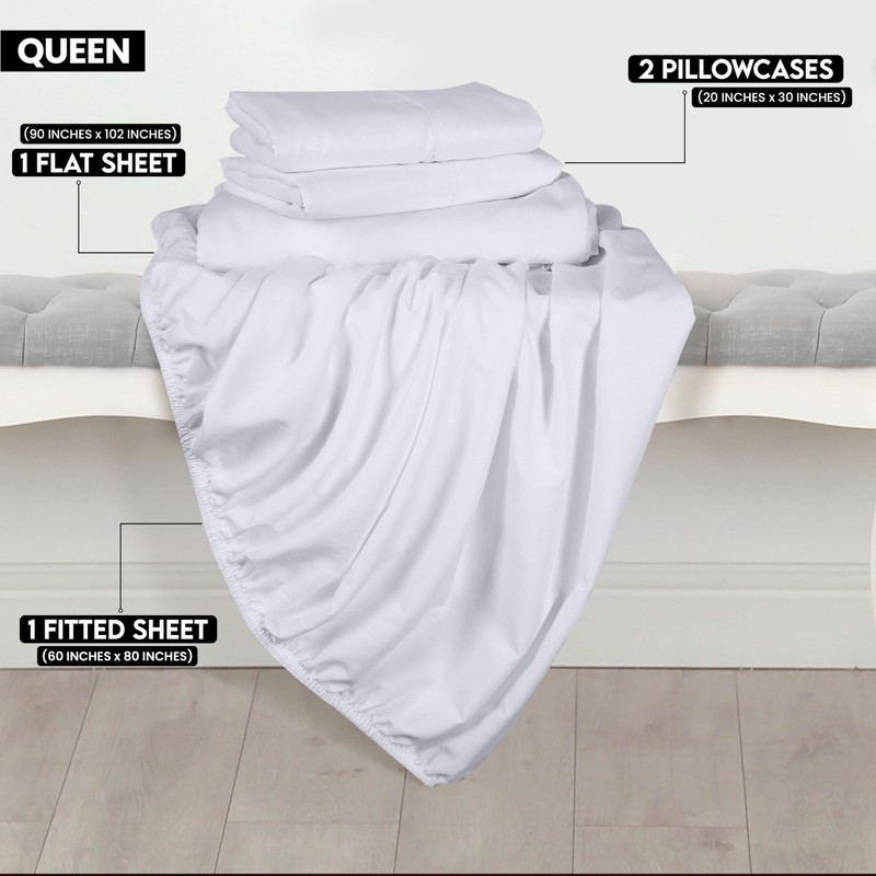 - A Complete Bed Sheet Set - The 4-piece queen size sheets set includes 1 flat sheet (90 inches x 102 inches) , 1 fitted sheet (60 inches x 80 inches) with 15 inches deep pocket, and 2 pillowcases (20 inches x 30 inches)