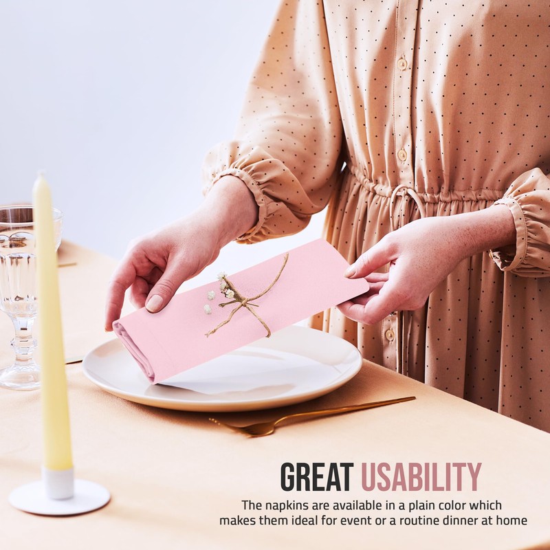 - PREMIUM QUALITY FABRIC – The dinner napkins are constructed from 100% Polyester material, offering a soft texture and lasting wear. Our cloth napkins are stain and wrinkle resistant, allowing you to fold according to the nature of the event.
