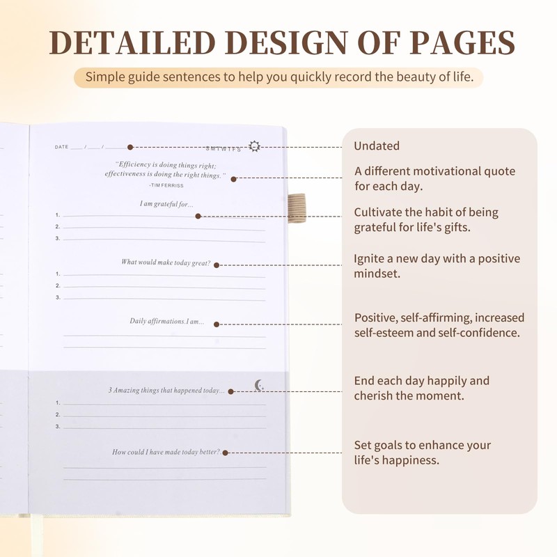 Undated: Each page of the gratitude diary is not labeled with the date, so you don't need to skip pages when using it in daily life, and it is not limited by the date, which greatly reduces unnecessary waste.