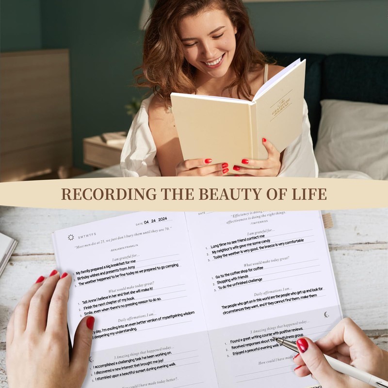 - HIGH-QUALITY AFFIRMATION JOURNAL: Gratitude journal for women is 5.5" x 8.2", 2 pcs (120 pages per book), and per book can be used for 4 months. For the inside of the journal with prompts, we use 100gsm thick offset paper, which is smooth, does not easily curl the edges, and does not bleed ink. The cover is frosted and waterproof. The frosted texture makes gratitude journal for men look more advanced and incorporates waterproof technology, so you won't be afraid of getting them wet.