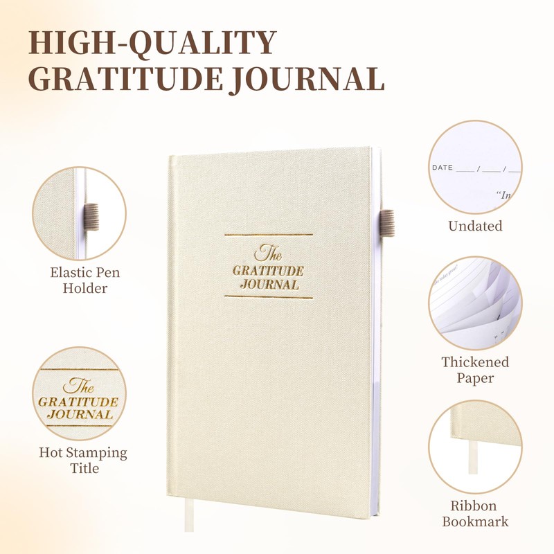 - SMALL DESIGN: 1, Stamped Gold Font. The font color on the cover is shimmering gold, adding sophistication and panache to the simple, plain daily gratitude journal. 2, Pen Cover Design. The elastic pen cover is compatible with a wide range of daily pens, pencils, and ballpoint pens that can be put in, there is no need to look for pens everywhere. 3, Undated. In a journal for women every page of the inner pages is not labeled with the date, a good way to avoid unnecessary waste.