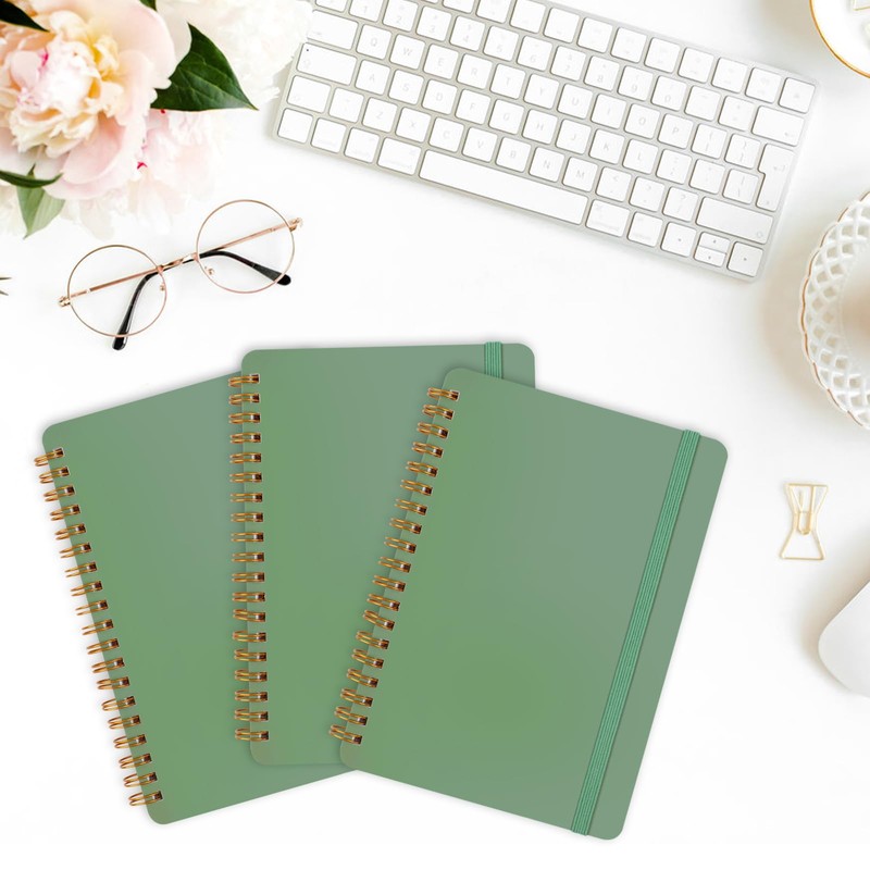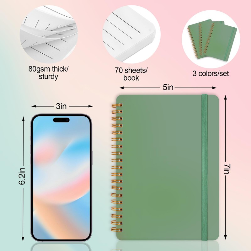 - 3 SMALL SPIRAL NOTEBOOK 5x7: There are 3 hardcover spiral journal notebook, measuring 5 "x 7". This hardcover spiral notebook is 70 sheets each and the color choice of green makes the cute notebooks for women look simple and rustic, exuding serenity and mystery. The perfect 5x7 notebook is great to carry around or put in backpacks and luggage.