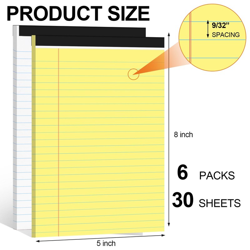 - LEGAL PAD SET: These small legal pads 5x8 have 6 packs, and each notepad has 30 sheets. Small note pads 5x8 leave enough blank area at the top, you can use it as a to-do list, or shopping list. Small note pads 5x8 have double red vertical lines on the left side, the categories and contents are written in separate areas when you are taking notes, which helps you to quickly read notes and create.