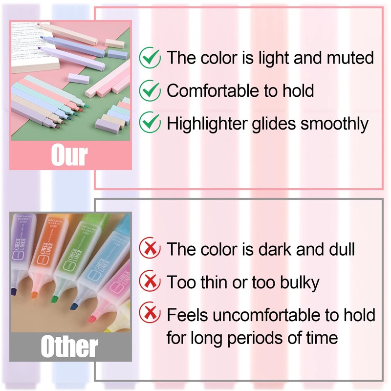 - Comfort level: The color of the pastel highlighters appearance is very warm, bright and soft. The aesthetically pleasing pastel highlighter is comfortable to hold and prevents hand fatigue, ensuring that one's hands do not get tired during use.