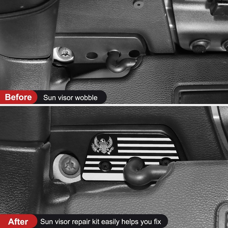 - [Easy Removal and installation] With the wrangler sun visor repair Kit, the installation process is quick and easy, use a Phillips screwdriver to remove the original screws, place the bracket around the sun visor and securely install the new screws. Takes only a few minutes to install.
