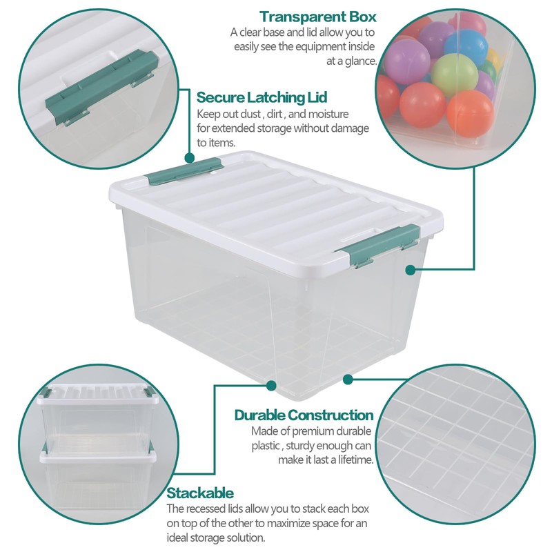 • Clear storage bin with white lid, green latch, volume 12 Qt