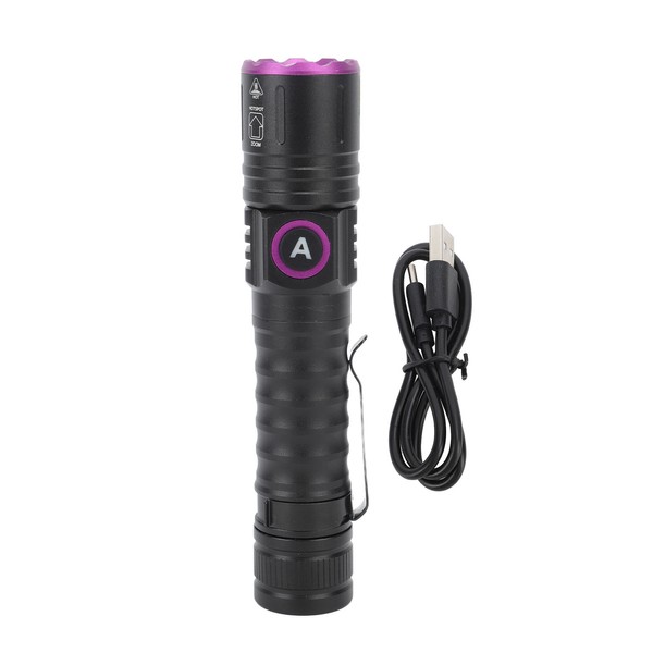 1、395nm UV flashlight: Provides 395nm UV and black light for easier detection of dry pet urine stains, the UV flashlight can also help with antique identification, resin curing, UV paint glowing, and discovering hidden cracks for repair. 2、Multi Functional Waterproof: A handy assistant for household chores (dog and cat stains), detects fluorescents, stamps, minerals, cat moss, etc. The IPX4 waterproof rating and durable aluminum body ensures that the flashlight can be used in all weather and conditions.The flashlight can be used in all weather and conditions. 3、Space Saving: Compact, lightweight and convenient. Easily fit the UV flashlight into your pocket, backpack, toolbox and your car. 4、Applicable Occasion: This UV flashlight is suitable for various surfaces in the living room, kitchen, bathroom, bedroom, garage and car. 5、Zoomable Lens: Zoom in or out to adjust the right range of light. Zoom in to surround the suspicious area and zoom out to mark your pet's urine. The body is made of premium aluminum alloy, which has the advantage of durability and no fear of falling.