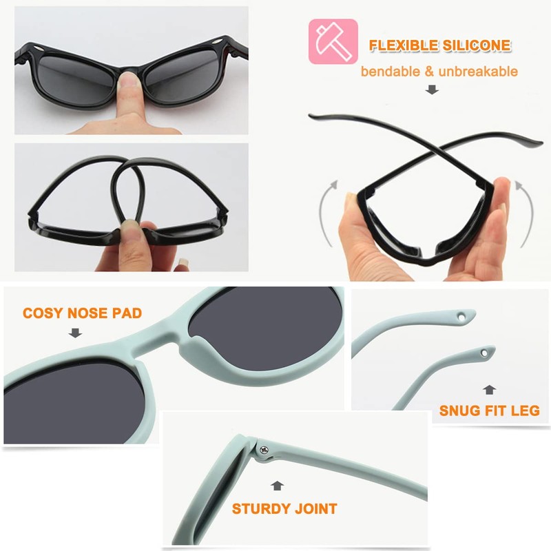 - ⛅ Snug Fit with Strap: this comfortable baby sunglasses coming with soft strap, fits comfortable around the back of your baby's head and keep the sunglasses stay on, even with tiny ones. Bonus with carry pouch and wipe cloth, polarized test card.