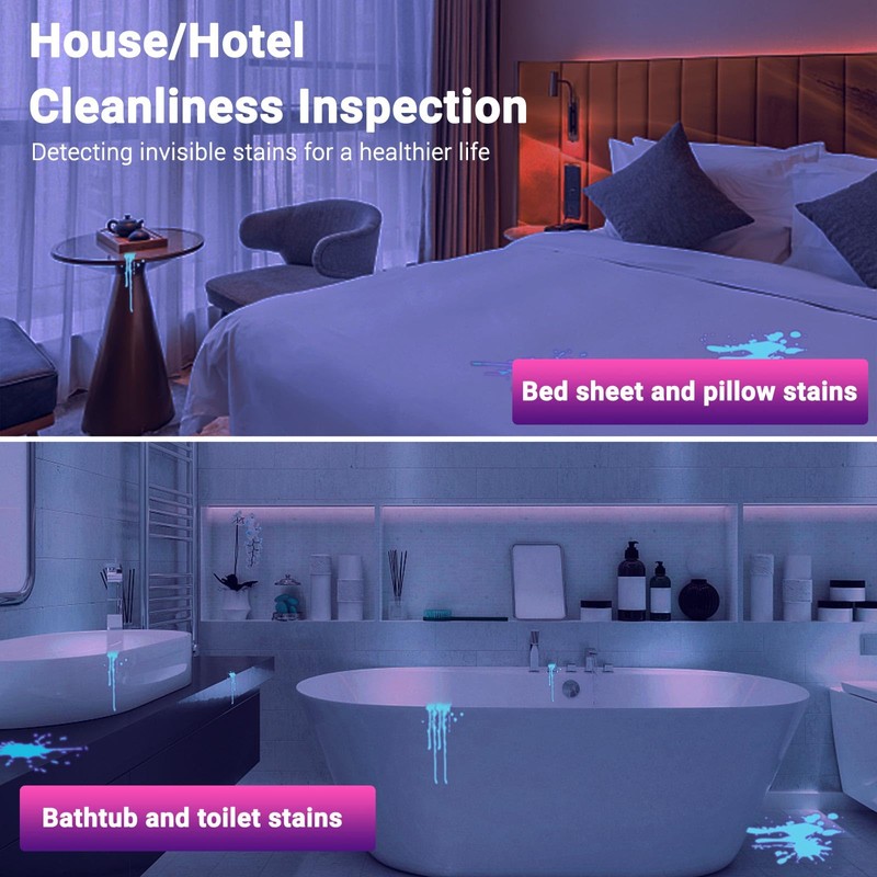 • FIND INVISIBLE STAINS - The human eye has a limited range of vision. And this black light pen can help you view some stains that are invisible to the naked eye. UV light can cause some stains that we can't see to fluoresce. So this mini uv light can help us to see dry stains in sofas, carpets, clothes, bed linen, and bathrooms. A good helper for household cleaning.
