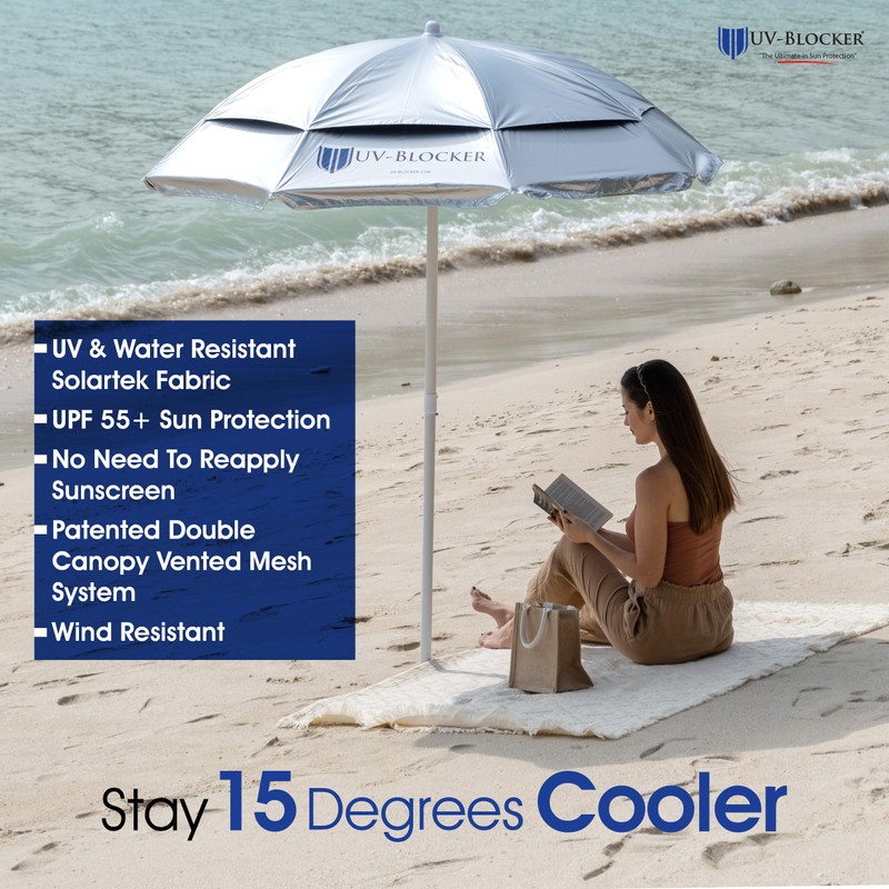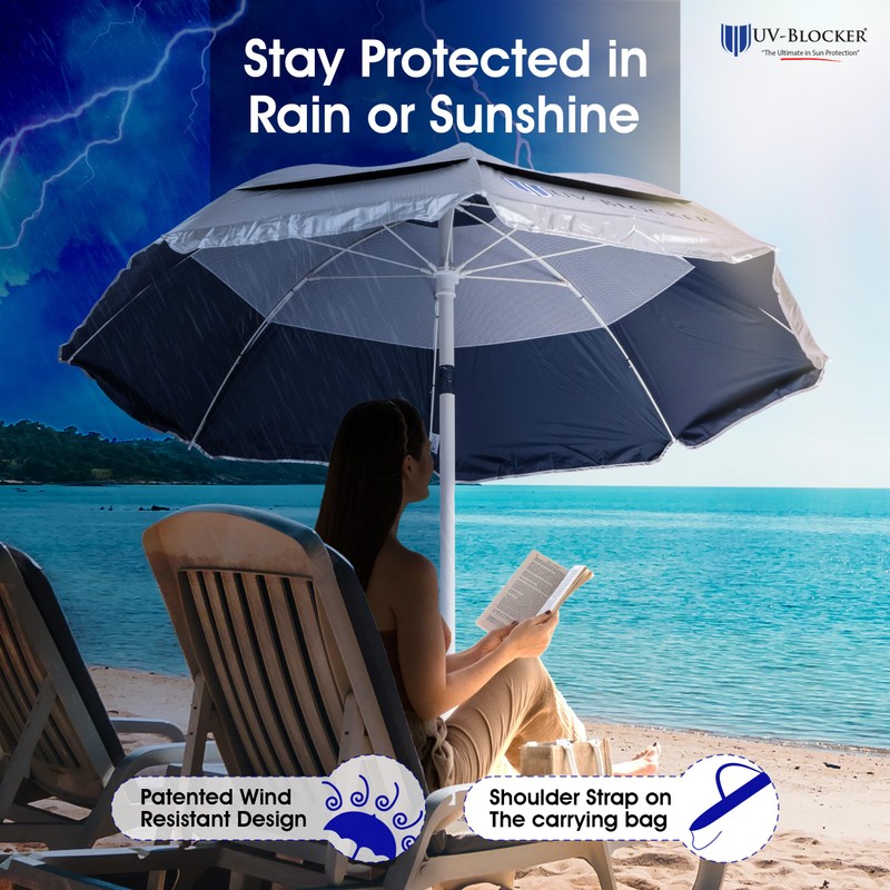 UV-Blocker 6 Ft Beach Umbrella UV Sun Protection Heavy Duty Sun Blocking Windproof Auto Open Vented Double Canopy UPF 55+ Blocks 99% of UVA UVB Rays