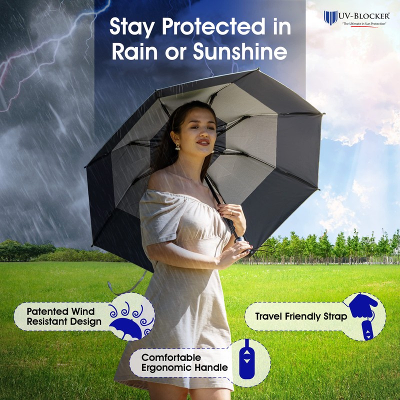 UV-Blocker Sun Umbrella UV Protection Large Folding Umbrella - Sun Blocking - Windproof - Auto Open - Vented Double Canopy - UPF 55+ - Blocks 99% of UVA UVB Rays - 58"
