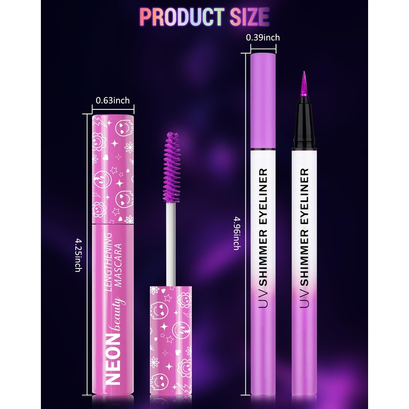 UV Neon Purple Mascara & Eyeliner Set, Waterproof Volumizing Colored Mascara Volume and Length for Lashes Lengthening, Long Lasting Glitter Liquid Eyeliner Pencil, Halloween Glow in the Dark Makeup-01