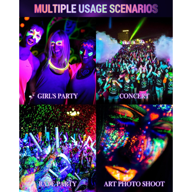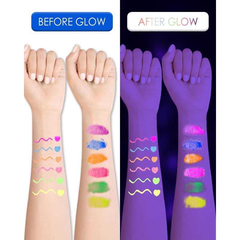 • The High Pigment - Rainbow Neon Makeup Set includes 6 bright colors that are harmoniously matched to make each makeup look eye-catching. Under natural light, they display rich and vibrant colors, adding a wild charm to any makeup look. Under ultraviolet light, they will emit astonishing fluorescent colors. Therefore, from morning till night, you can shine with bright and colorful makeup and exude charming appeal in any occasion