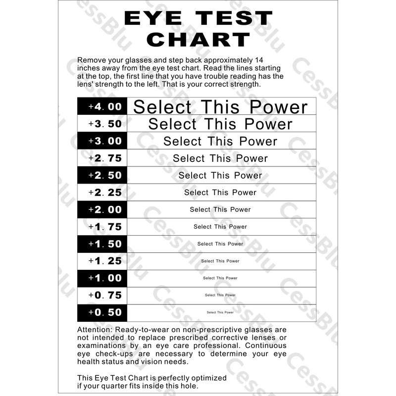 - KINDLY NOTICE - If you cannot make sure which magnification strength to choose, please use the EYE TEXT CHART we provide on the left. Please specify magnification strength before your pay. Thanks!