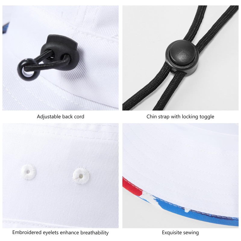 • Drawstring at the back for adjustable sizing; Removable chin strap with locking toggle for windy days; Sweatband prevents sweat from getting into your eyes