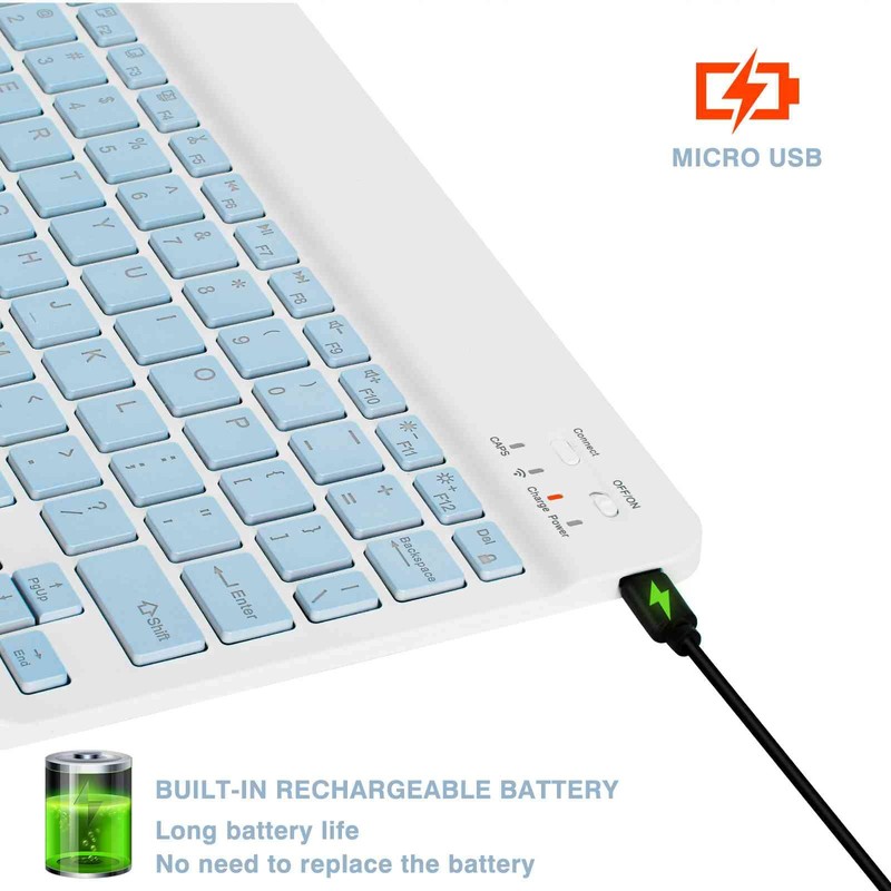- ECO-FRIENDLY TECHNOLOGY & RECHARGEABLE BATTERIES — The Bluetooth keyboard has a remarkably long-lasting rechargeable battery inside that allows for up to 90 hours of nonstop typing on a single charge. It has an energy-saving mode for environmental conservation that puts the keyboard to sleep after 30 minutes of inactivity to reduce wasteful energy use.