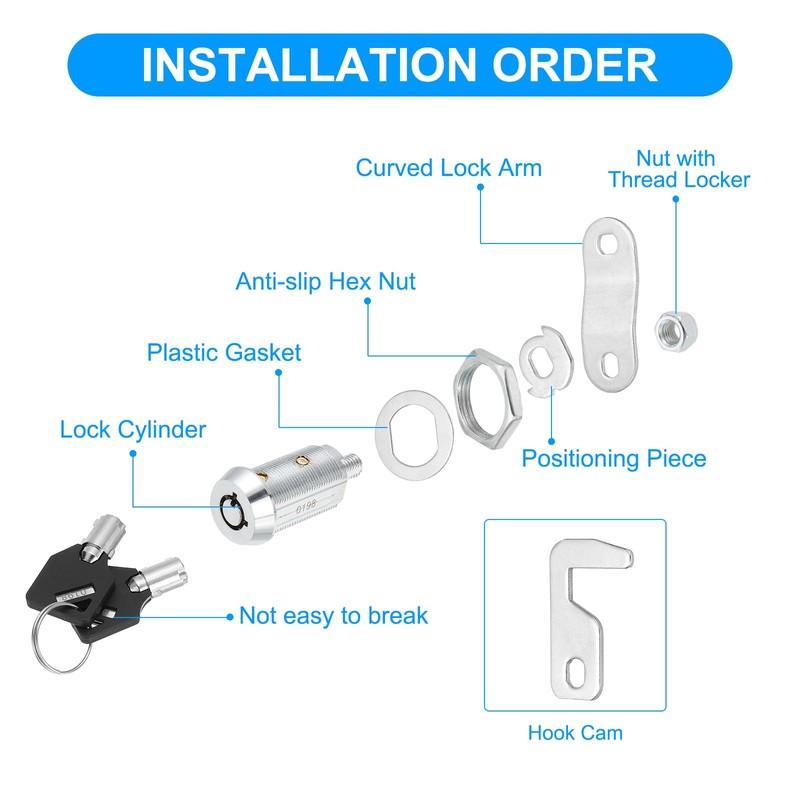 • Advantage: 90-degree rotation to open. Cam lock has a chrome-plated surface, is waterproof and rustproof, and has a long service life. Cabinet locks come as a complete set, each with 2 thickened locking arms to meet your installation needs.
