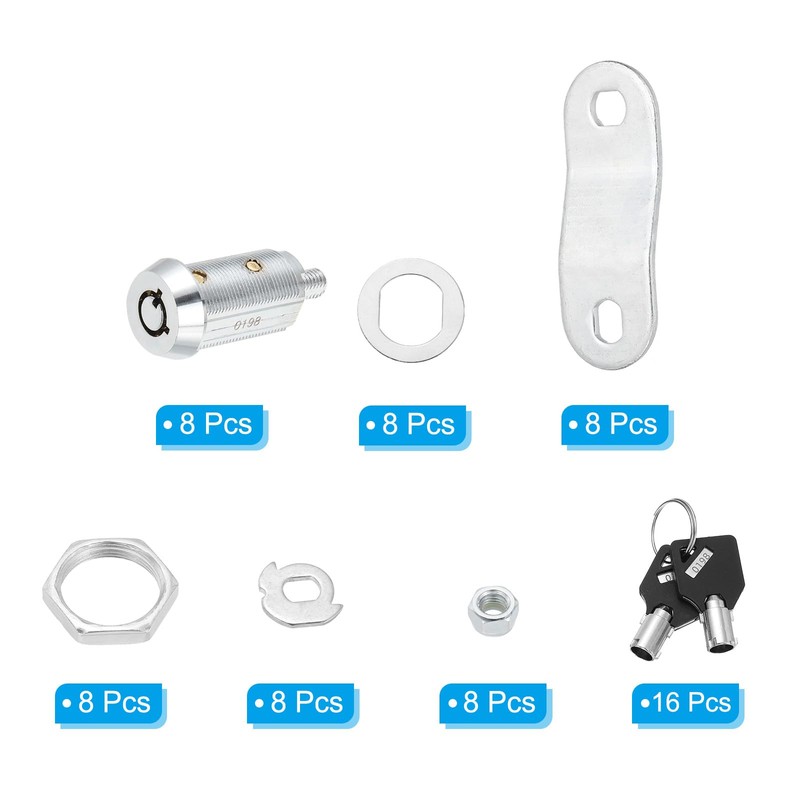 • Size: Color: Silver; Material: Zinc Alloy; Size: 30x21mm/1.18x0.83inch(LxW); Mounting Hole Diameter: 30mm/1.18inch; Straight Cam: 51.5x18.9mm/2x0.6inch(LxW); Curved Cam: 39.9x15.5mm/1.6x0.6inch(LxW); Package List: 8 x Cabinet Lock, 16 x Key