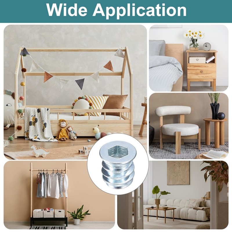 3. Easy To Use: First drill a hole with a depth of 1-2 mm longer than the furniture screw, and then use the provided hexagonal wrench or other optional driving tools to install the nut. If the furniture's wood hardness is higher, please enlarge the screw hole.